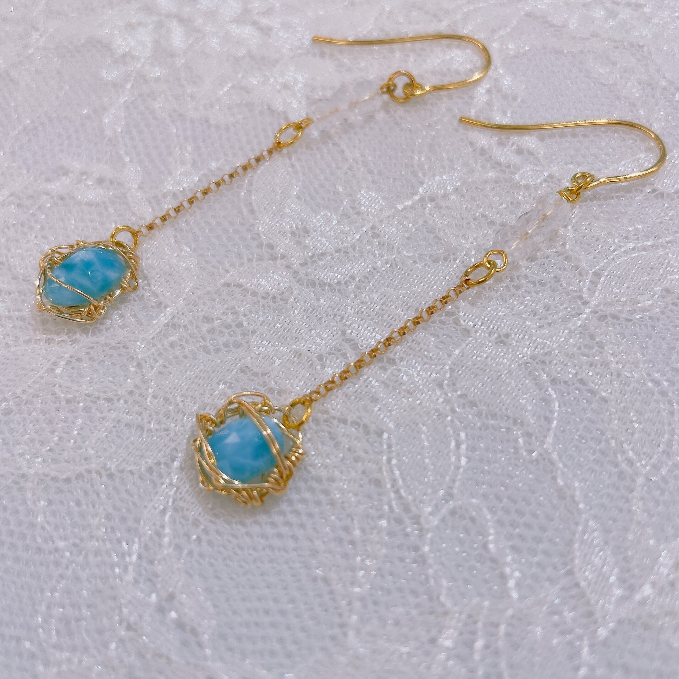 ラリマー&ムーンストーン 揺れるワイヤーデザインピアス